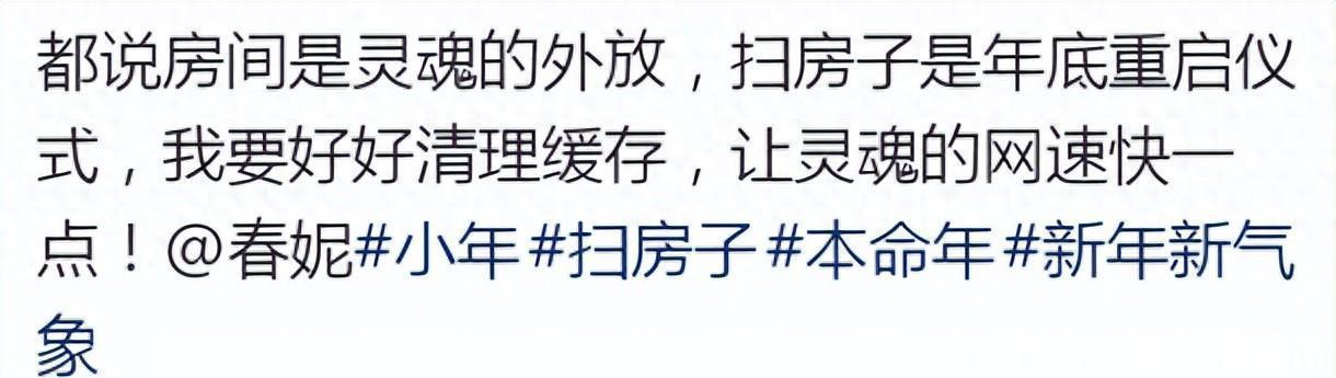 2月11日,农历腊月二十四,正是南方过小年的时候。主持人春妮在自己的社交账号上晒出了大扫除的照片,还写道:“大家都说,房间是灵魂的外在表现,打扫家里就是给年底做个重启。”这话一出,听着就觉得她特别勤快能干。